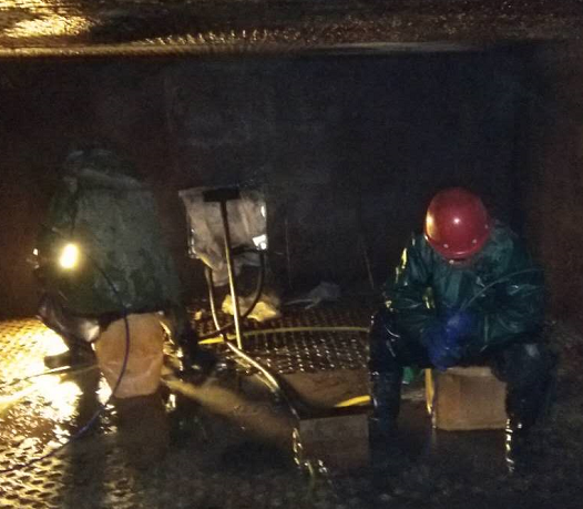 因2#鍋爐上下級空預(yù)器堵塞嚴重,無法滿足生產(chǎn)負荷要求,影響鍋爐正常運行,2019年1月14日9點30分,根據(jù)公司停車檢修計劃,對2#鍋爐空預(yù)器管進行清洗及疏通,首先在煙道底部制作排水口,引至地溝,保證現(xiàn)場路面無積水及結(jié)冰,待空預(yù)器內(nèi)溫度下降,公司領(lǐng)導(dǎo)組織崗位人員輪流進入空預(yù)器清理積灰,為空預(yù)器管道清洗及疏通做好各項準備工作,15日正式使用清洗機對空預(yù)器進行帶壓清洗,所有人員不怕苦、不怕累、放棄休息時間協(xié)助外包人員及時疏通空預(yù)器堵塞管道,更換空預(yù)器套管,檢修人員雖然穿著厚厚的棉衣,但不一會也被寒冷打透。手凍僵了,他們搓了搓接著干。