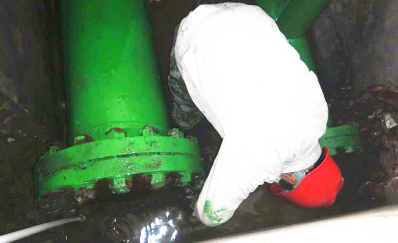 原鹵管線是采鹵崗位重要的組成部分,是停車必檢項之一。但是檢修難度不小,一是過道空間狹小,光線昏暗,一次僅夠兩個人同時作業(yè);二是檢修原鹵管線時,必須“涉水”作業(yè)。檢修期間原鹵管線一閃一閃的焊光將周圍照亮,順著火花向里看去,只見有兩個人在狹小的空間綣著身子低頭忙活著,感覺身子都轉(zhuǎn)不開的樣子。他們像小貓似的蜷縮在兩邊,全身濕透,白色的工服也被銹漬染的亂起八糟,被油漬沁透成一坨一坨的,但他們堅定的眼神、專注的神情卻叫人佩服。我不禁問道:“這么窄的空間人咋進去。俊他們開玩笑的說:“用縮骨功!”