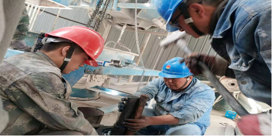 在其他設(shè)備檢維修現(xiàn)場,工人們依然具備這種“責任心”,如生料裝置接力風機維修現(xiàn)場,檢維修工人通過測振儀更換“主軸”。