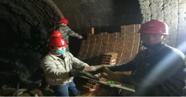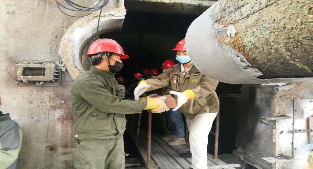 在回轉(zhuǎn)窯挖補窯磚現(xiàn)場,他們手傳手,開展接力,窯磚補填……