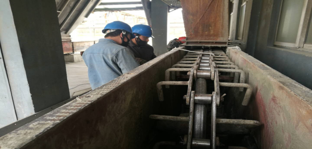 全心全意,爭分奪秒。鉗工電工配合默契,拉倒鏈、抬撬杠,大家齊心協(xié)力快速地1909提升機板鏈進行新舊置換。