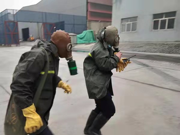 各組人員迅速展開搶險救援步驟。調(diào)度張培基抽調(diào)班組義務(wù)消防員攜帶應(yīng)急物資(正壓式空氣呼吸器、酸堿手套、防毒面罩、警戒帶、雨鞋、雨衣、應(yīng)急藥箱)至2#脫硫配漿池處集合……以氨罐區(qū)為中心點,將半徑20米范圍內(nèi)人員進行疏散,根據(jù)風(fēng)向標(biāo)指示情況,將人員轉(zhuǎn)移至上風(fēng)口安全地帶,對泄漏點南側(cè)、北側(cè)、西側(cè)三面警戒隔離,防止無關(guān)人員進入;義務(wù)消防員佩戴正壓式空氣呼吸器,穿防護服至脫硫罐區(qū)打開噴淋裝置,落實泄漏點具體位置,稀釋有毒氣體,并立即對泄漏點進行修復(fù)。經(jīng)過15分鐘的現(xiàn)場搶險救援,氨水泄露得到有效控制。