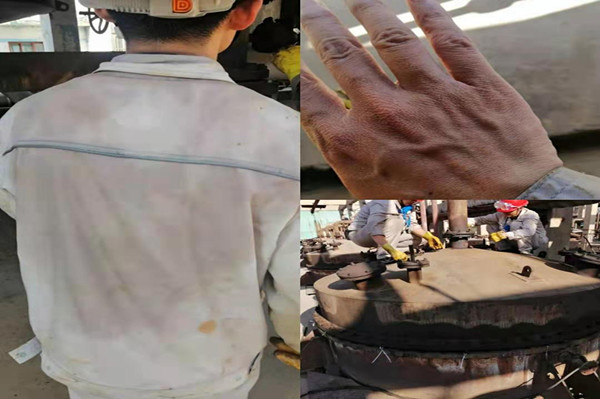 大家都知道轉(zhuǎn)化現(xiàn)場溫度很高,而且近期外界氣溫已高達三十七八度。轉(zhuǎn)化現(xiàn)場溫度都接近于45度左右,如同一個大蒸籠,而轉(zhuǎn)化人員卻每天都在這個大蒸籠里工作;每每投甩完一臺轉(zhuǎn)化器后,衣服已全部被汗水浸透;到汗珠流到眼睛后,加之與氯化氫氣體接觸,眼睛完全睜不開;在拿掉塑膠手套的那一刻,一雙手被捂的發(fā)白發(fā)皺;如同在水里浸泡了數(shù)小時一樣,但是就在這樣的工作環(huán)境下,卻沒有一個人退縮,都在堅守著自己的工作崗位,做出最大的奉獻。
