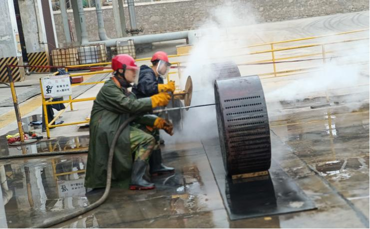 檢修已經(jīng)是第三天,接近尾聲,大家似乎已經(jīng)疲憊,但是行動(dòng)上未松懈。今日的氯化氫小廣場(chǎng)上格外熱鬧,7:20,班長(zhǎng)已經(jīng)開始準(zhǔn)備今日的檢修票證,為檢修項(xiàng)目做準(zhǔn)備。他的身影在朝陽(yáng)地映射下顯得那么著急,沒(méi)有一點(diǎn)怠慢的意思,今天我們班組檢修的項(xiàng)目是提濃塔再沸器石墨塊疏通工作,這項(xiàng)工作看起來(lái)簡(jiǎn)單,實(shí)際上是耐心地考驗(yàn)。一個(gè)個(gè)細(xì)小的石墨孔需要用蒸汽一個(gè)一個(gè)疏通,檢修開始之前還是和往常一樣,安全教育是少不了的,班長(zhǎng)一遍遍強(qiáng)調(diào)防護(hù)用品規(guī)范佩戴以及疏通過(guò)程中的安全注意事項(xiàng),在準(zhǔn)備工作結(jié)束后,今天的檢修工作開始了。