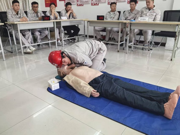 比賽現(xiàn)場,參賽隊(duì)員們個個精神抖擻、斗志昂揚(yáng)!靶姆螐(fù)蘇操作”“正壓式空氣呼吸器穿戴”兩個項(xiàng)目,選手們爭分奪秒?yún)s有條不紊:檢查患者意識和呼吸、檢查氣瓶壓力、調(diào)整背帶松緊、佩戴面罩并測試氣密性……一套流程行云流水,展現(xiàn)出扎實(shí)的技能功底與高度的安全意識;顒蝇F(xiàn)場,公司安全總監(jiān)鐵旭東、安全主管何寧、海什全程監(jiān)督評分,并針對操作細(xì)節(jié)進(jìn)行實(shí)時監(jiān)控,將比賽轉(zhuǎn)化為安全培訓(xùn)課堂,達(dá)到競賽和培訓(xùn)相結(jié)合。參賽職工紛紛表示,通過比武不僅提升了應(yīng)急處置能力,更深刻體會到規(guī)范操作的重要性。