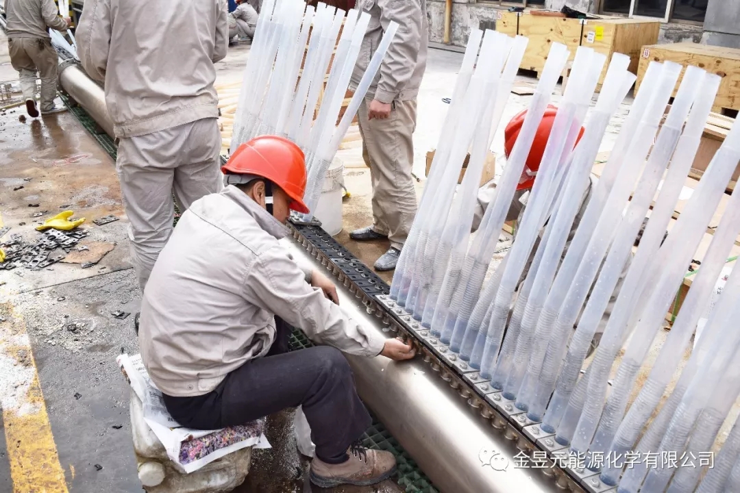 離子膜裝置B槽檢修作業(yè)現(xiàn)場,裝置將去年A槽檢修換膜總結(jié)的經(jīng)驗和方法充分運用到此次作業(yè)中,同時裝置檢修人員積極與廠家技術(shù)人員在鏟膠、貼膠、貼膜等作業(yè)方法和技術(shù)上進(jìn)行廣泛的交流學(xué)習(xí),有效加快了檢修進(jìn)度。