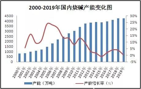 圖2 2000-2019年國內(nèi)燒堿產(chǎn)能變化圖