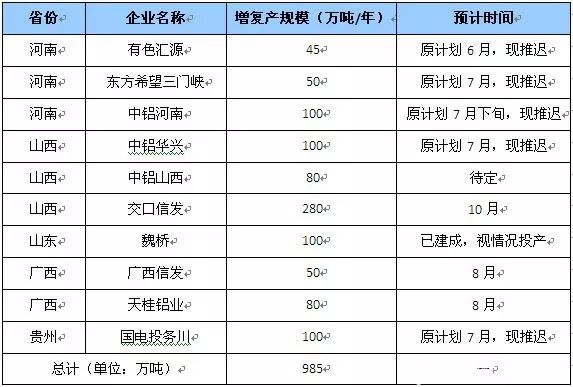 表1 2019年國內(nèi)氧化鋁增復產(chǎn)統(tǒng)計(數(shù)據(jù)來源:東證期貨)
