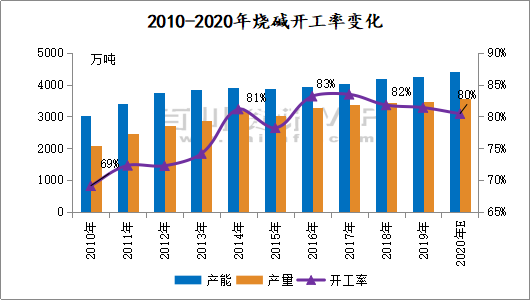 由此可見,2020年全國總產(chǎn)能實現(xiàn)穩(wěn)步增長,但整體增速相比同期有所下降,受全球公共衛(wèi)生事件沖擊,燒堿下游需求表現(xiàn)不佳,整體行情不甚樂觀。出于整體需求和供需平衡考量,預(yù)計未來產(chǎn)能增速將有放緩表現(xiàn),具體發(fā)展變化還需關(guān)注后續(xù)全球公共衛(wèi)生事件處置情況及市場行情實時變化。