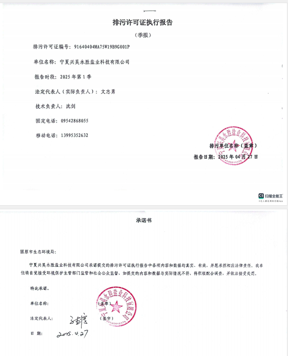 寧夏興昊永勝鹽業(yè)科技有限公司2025年第1季度排污許可執(zhí)行報告