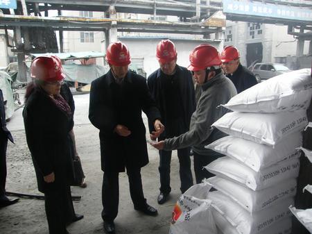 金昱元公司董事長代良云為自治區(qū)國稅局副局長陳連書介紹公司主要產(chǎn)品PVC樹脂的生產(chǎn)過程